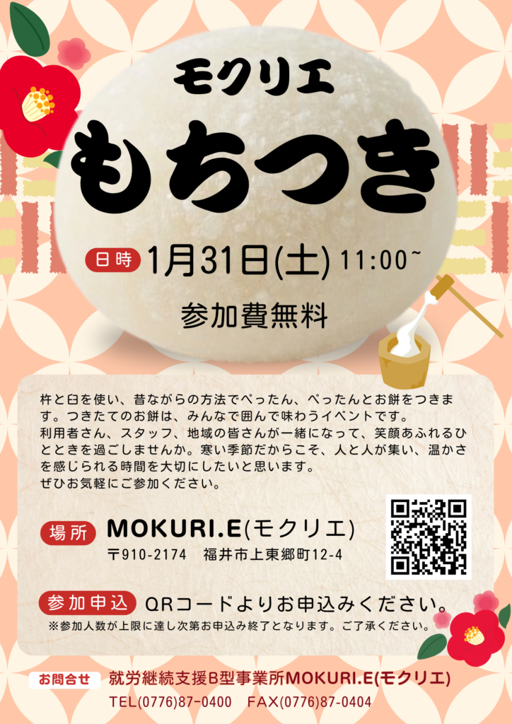就労継続支援B型事業所 MOKURI.Eでは、1月31日(土)11:00より、もちつきイベントを開催します。