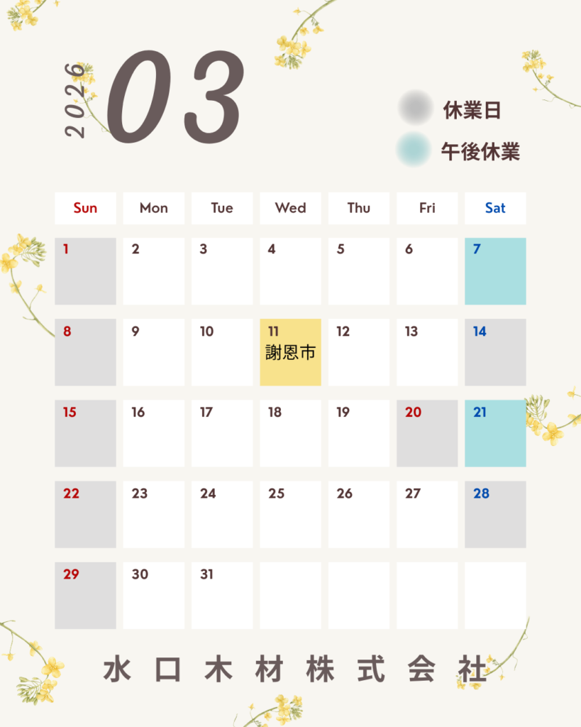 2026年3月の営業日について、下記の通りお知らせいたします。